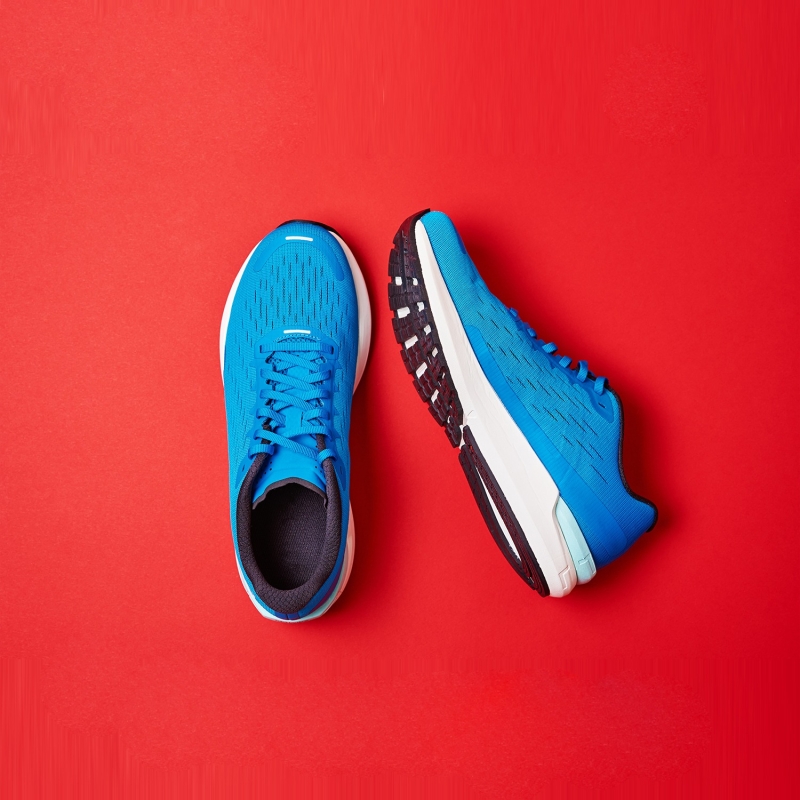 زوج من أحذية المشي الزرقاء ، مع تصميم منتظم ، تفاصيل الأربطة