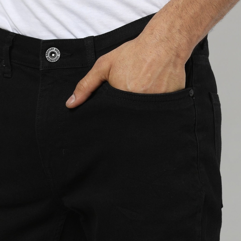 Black dark wash 5-pocket mid-rise jeans, clean look, no fade, has a button and zip closure, and waistband with belt loops
