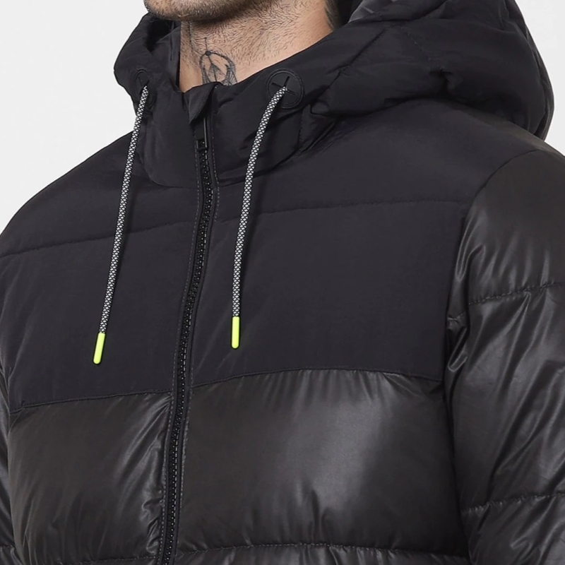 جاكيت مبطن باللون الأسود مع سحاب ، مزود بغطاء رأس ، 2 جيب ، إغلاق بسحاب ، أكمام طويلة ، حافة مستقيمة وبطانة من البوليستر