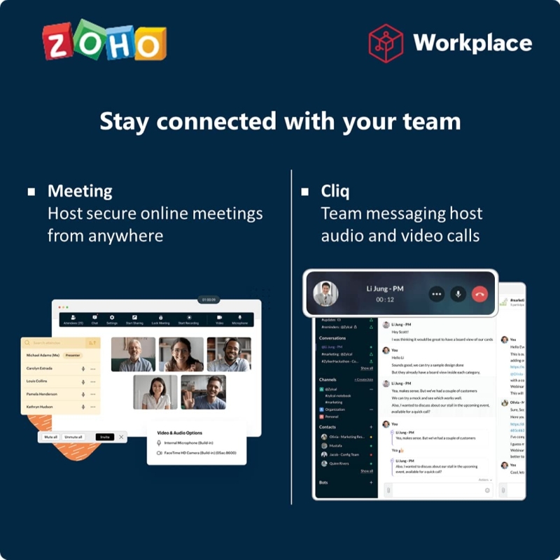 • Connect and collaborate with your team using online meetings, Email, Cliq. Securely create, store and manage files with Zoho Workplace, a better priced solution for your business